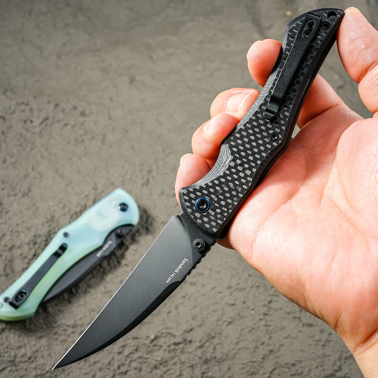 Ce couteau pliant associe une lame en acier 14C28N reconnue pour sa tenue de coupe et sa facilité d’entretien, à un manche en fibre de carbone et G10 offrant légèreté et contrôle. Sa conception ergonomique garantit une prise en main confortable pour un usage prolongé.
