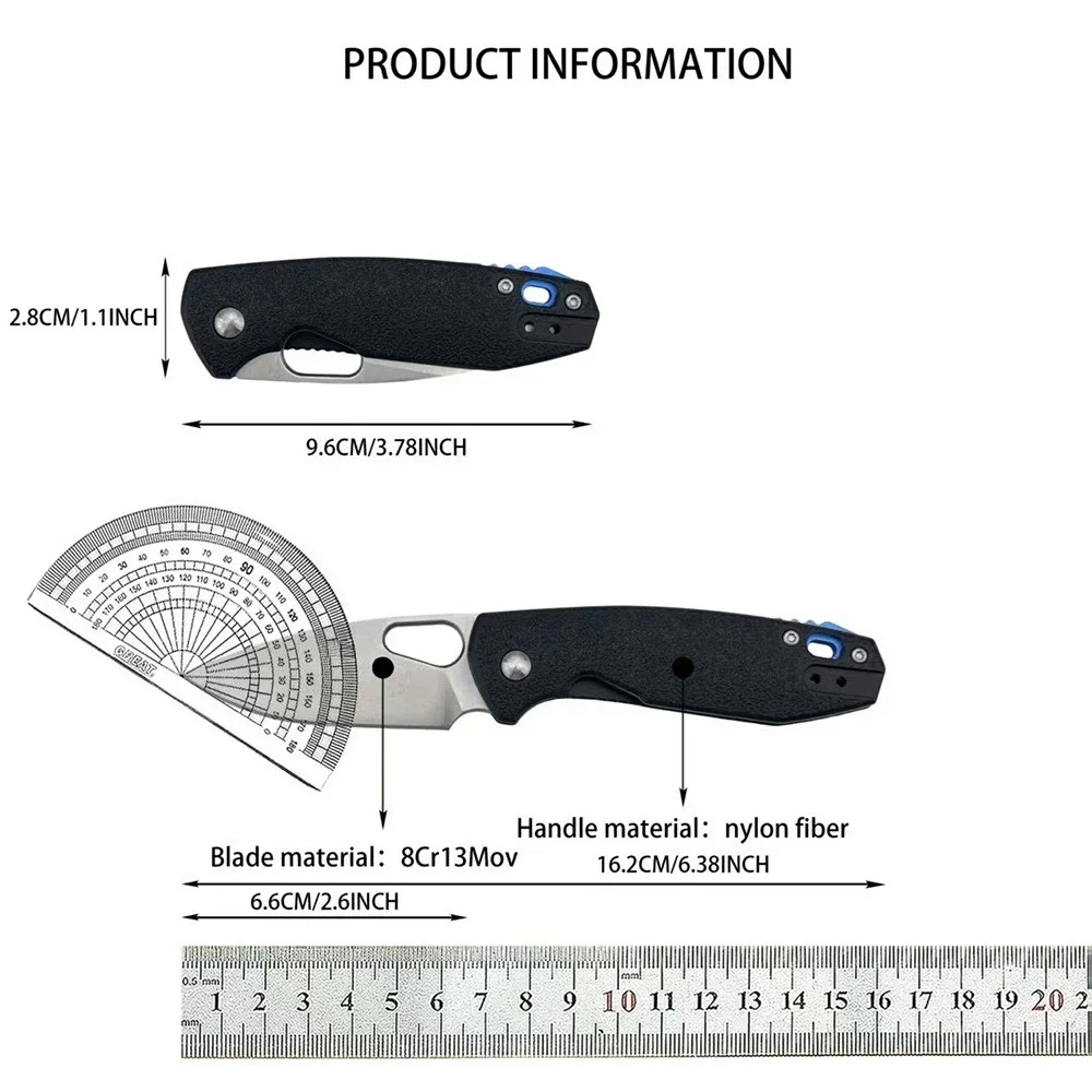 Ce couteau pliant mesure 16 cm une fois ouvert, avec une lame de 6,5 cm en acier 8Cr13MoV.