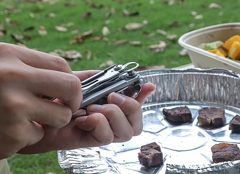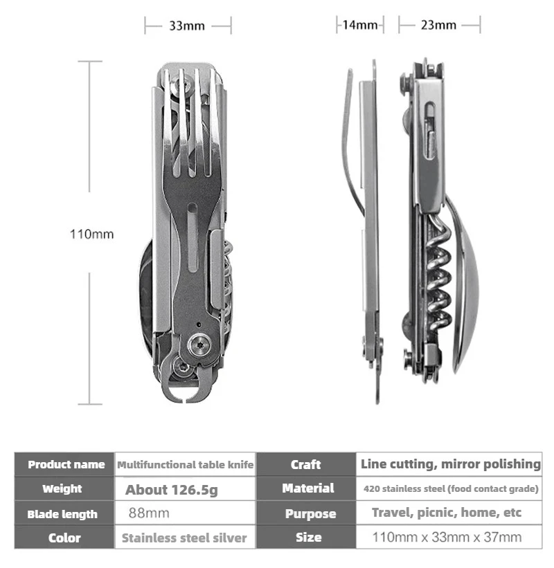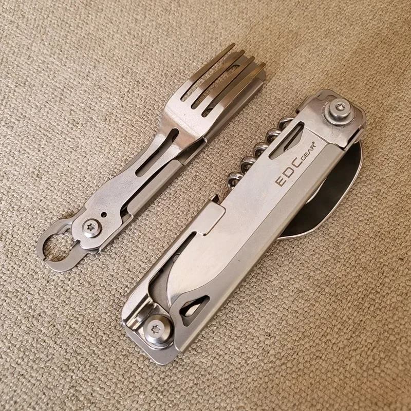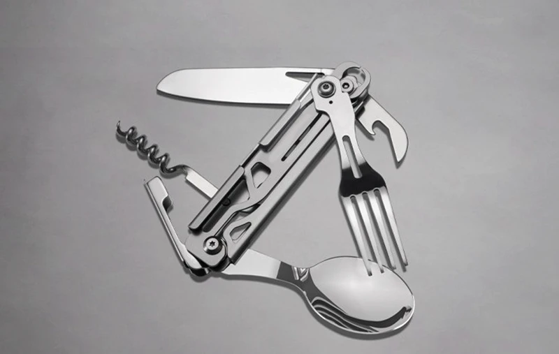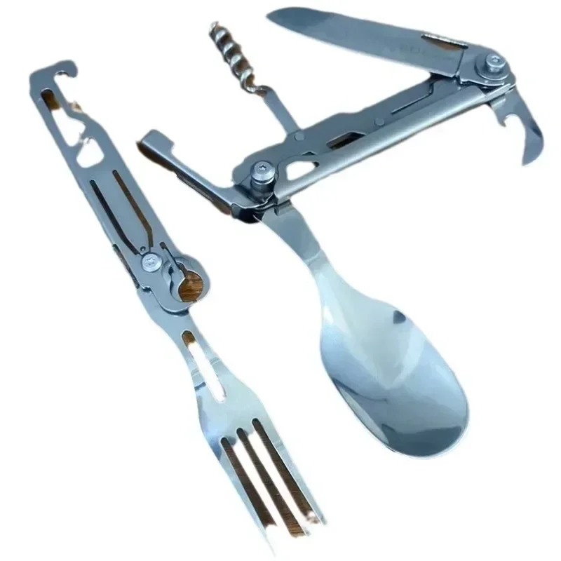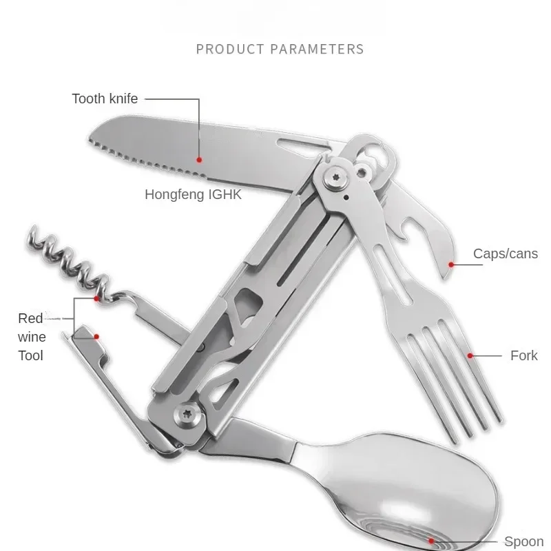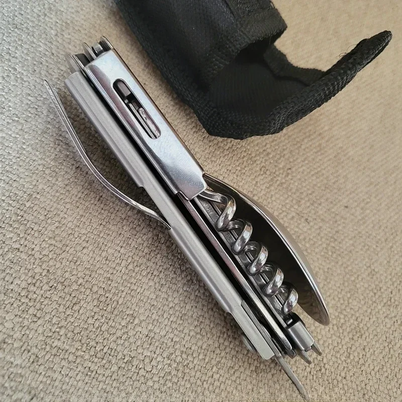 • Multifonction Complet : Regroupe un couteau, une fourchette, une cuillère, un tire-bouchon et un ouvre-boîte/décapsuleur en un seul outil compact.