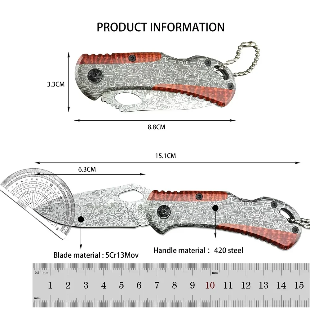 Ce mini couteau pliant mesure 15,1 cm une fois ouvert, avec une lame de 6,3 cm en acier 5Cr13Mov.