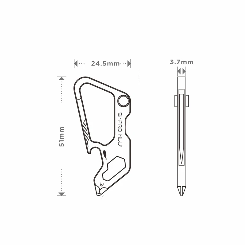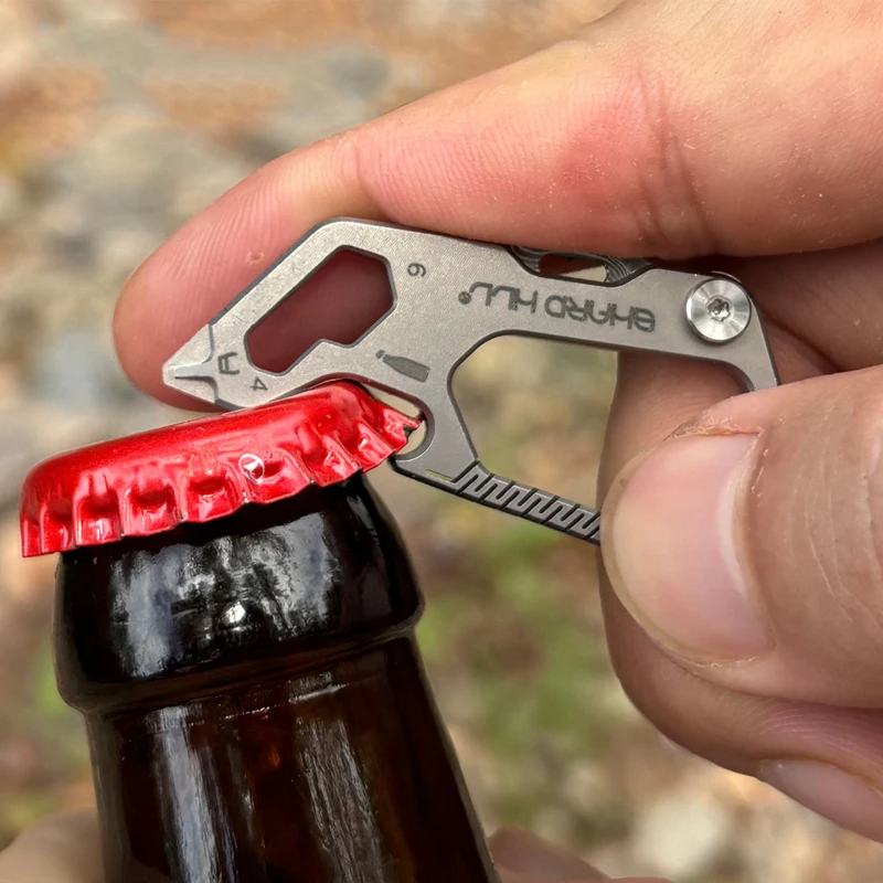 Ce mousqueton multifonction intègre les essentiels EDC : décapsuleur, tournevis plat, règle graduée et clip mousqueton. Il s’accroche au porte-clés ou au sac pour rester toujours à portée de main.