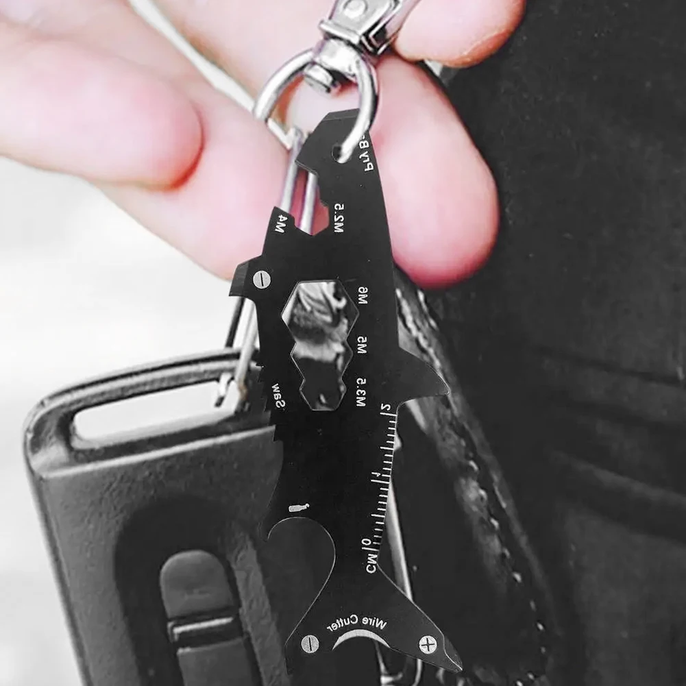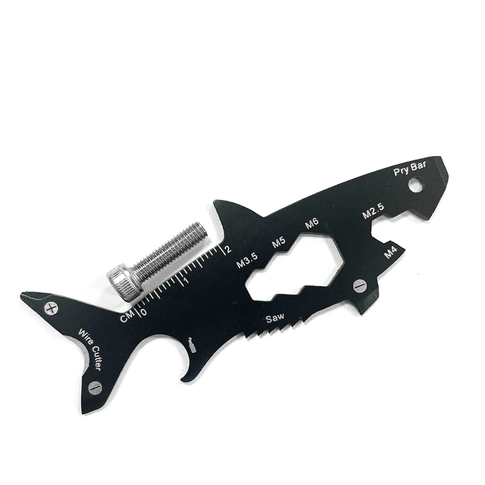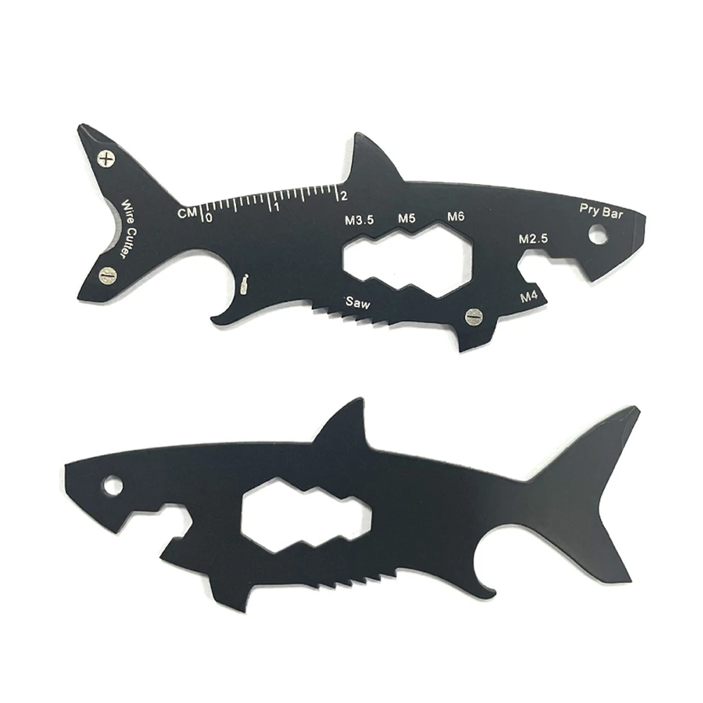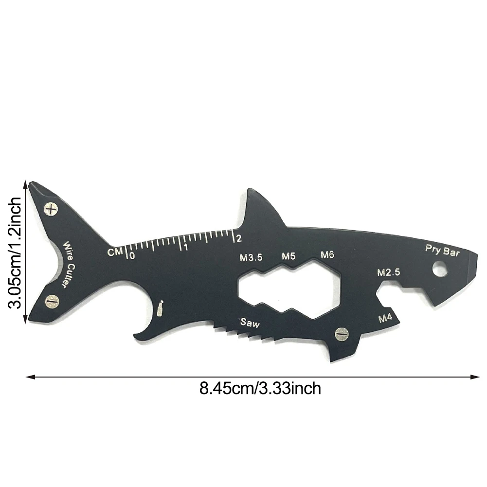 Cet ouvre-bouteille multifonction en forme de requin combine 15 fonctions essentielles dans un format compact.