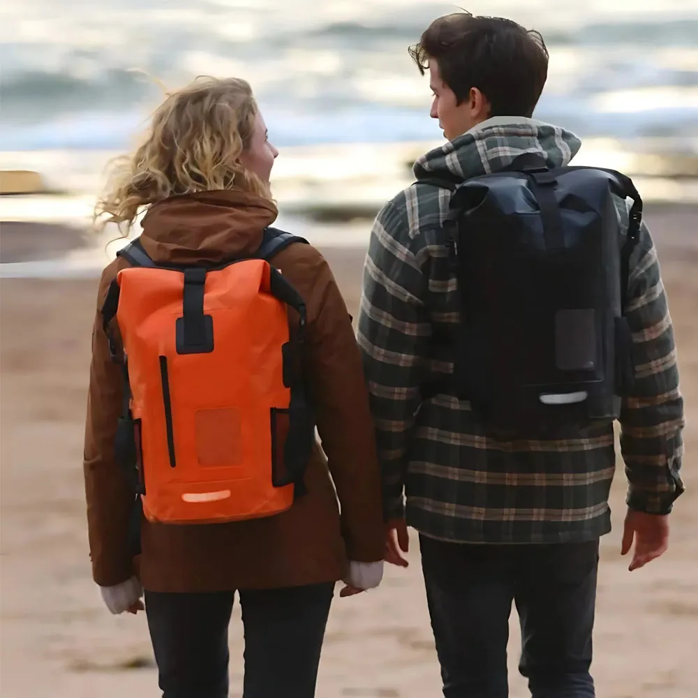 Le sac à dos étanche MinimalTrek utilise un système de fermeture par enroulement (Roll-top) couplé à un pressage à chaud sans soudure. Cette conception élimine les points de faiblesse traditionnels des sacs cousus. Sa construction robuste en 500D+PVC garantit une durabilité accrue face aux déchirures et aux environnements abrasifs, tout en offrant une interface pratique pour votre smartphone grâce à sa poche zippée transparente.