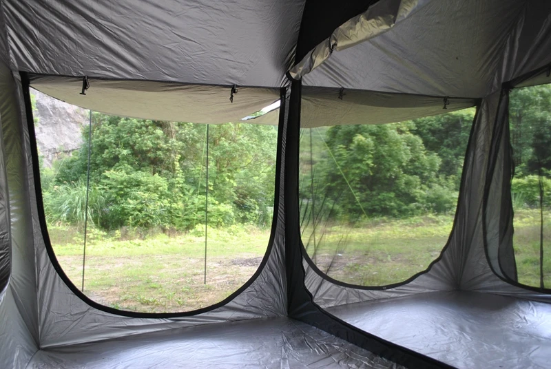 Le point fort de ce modèle réside dans ses capacités d’extension. La porte avant, une fois ouverte, se déploie pour former un auvent géant de 280 cm. De plus, chaque porte latérale s’étend également pour offrir des zones d’ombre supplémentaires (2,8 m x 1,4 m), doublant ainsi la surface protégée à l’extérieur de la tente.